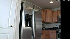 beautiful blonde in lingerie shows big breasts during kitchen photoshoot