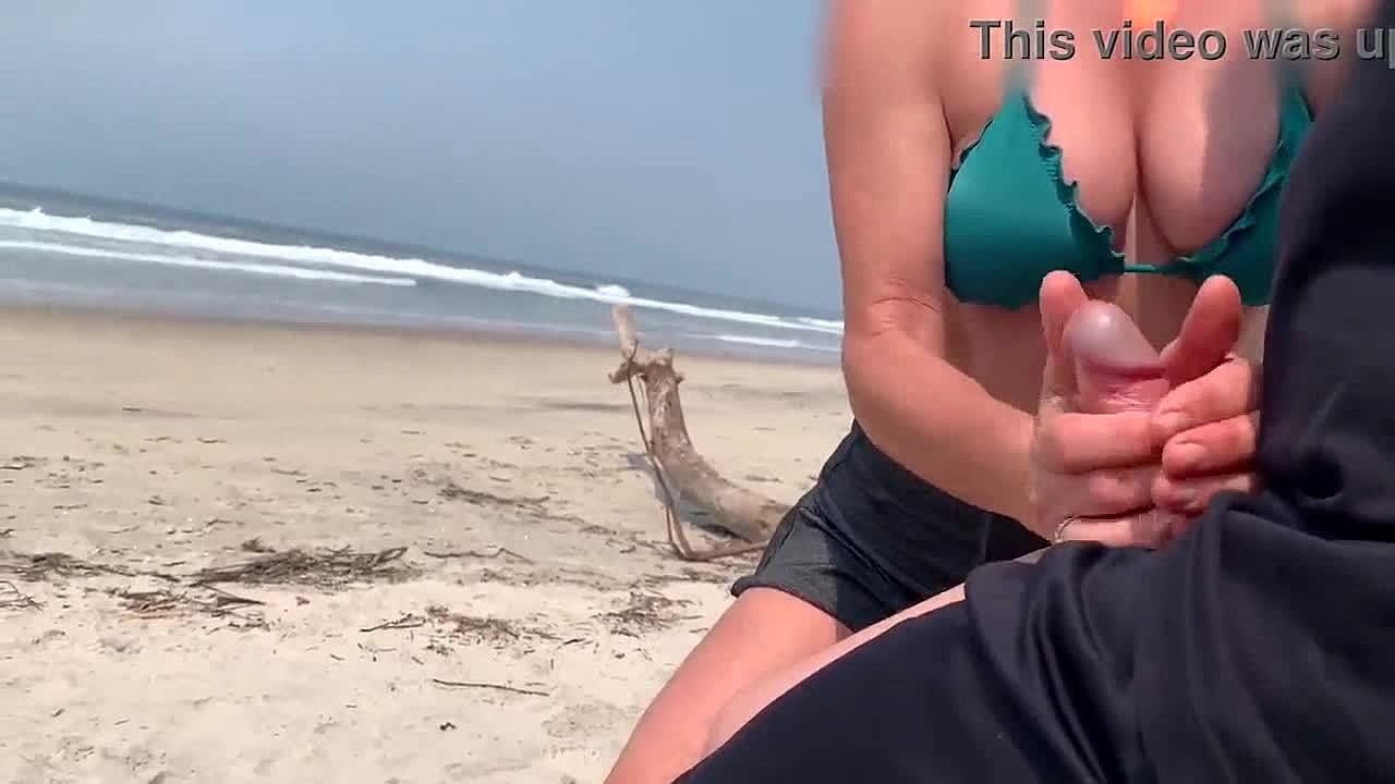 busty cougar shares her huge tits with a stranger on beach