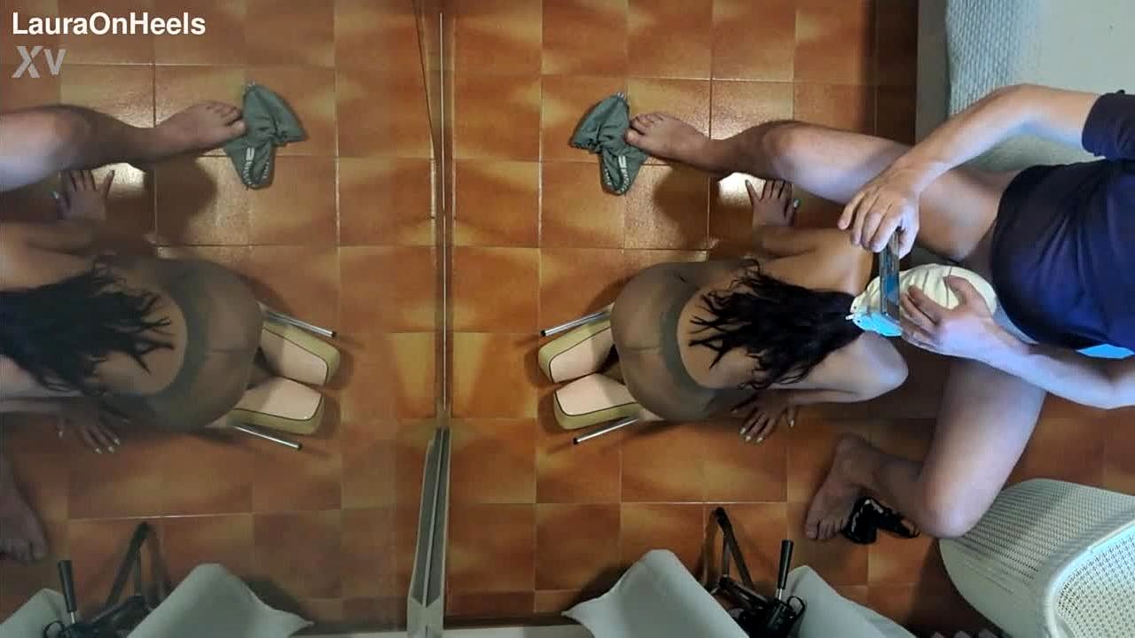 OMG, spying on my neighbor in sexy pantyhose and high heels bent over! 😍